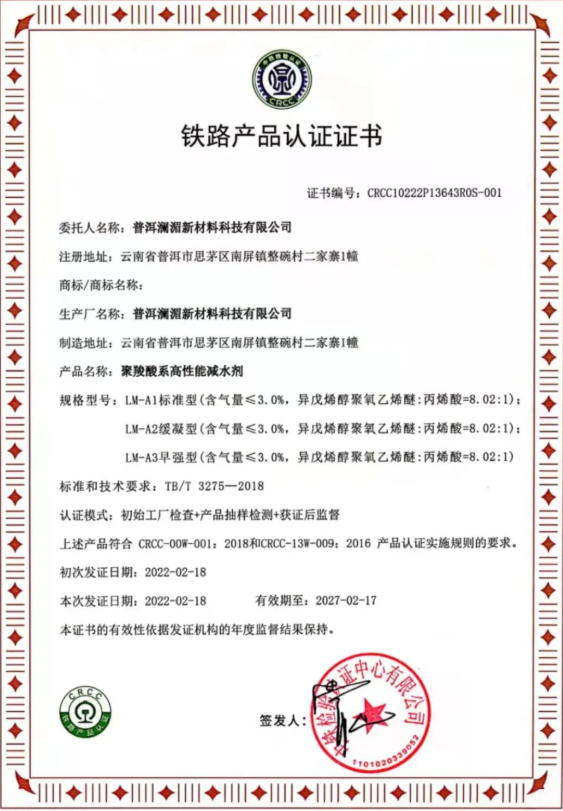 普洱瀾湄新材料科技有限公司于2021年12月順利通過中鐵檢驗中心認證,并于2022年2月18日頒發了CRCC“鐵路產品認證證書”。該項證書標志著我公司鐵路用聚羧酸系高性能減水劑系列產品已達到國家、行業高標準的要求,為公司進一步深入鐵路等國家基建項目建設打下堅實基礎。